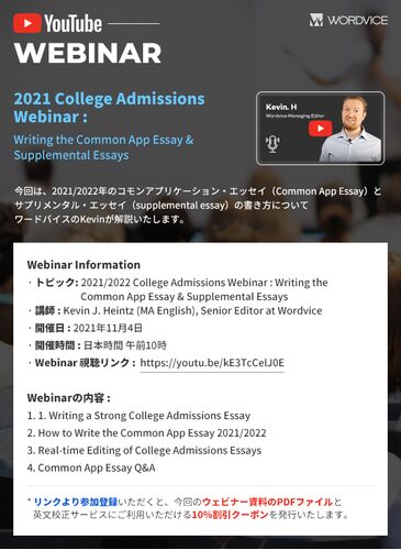 こんにちは!英文校正ワードバイスです。 前回に続き、以下の通り論文執筆Webinarを開催することとなりました。今回は、2021/2022年のコモンアプリケーション・エッセイ(Common App Essay)とサプリメンタル・エッセイ(supplemental essay)書き方をテーマ…